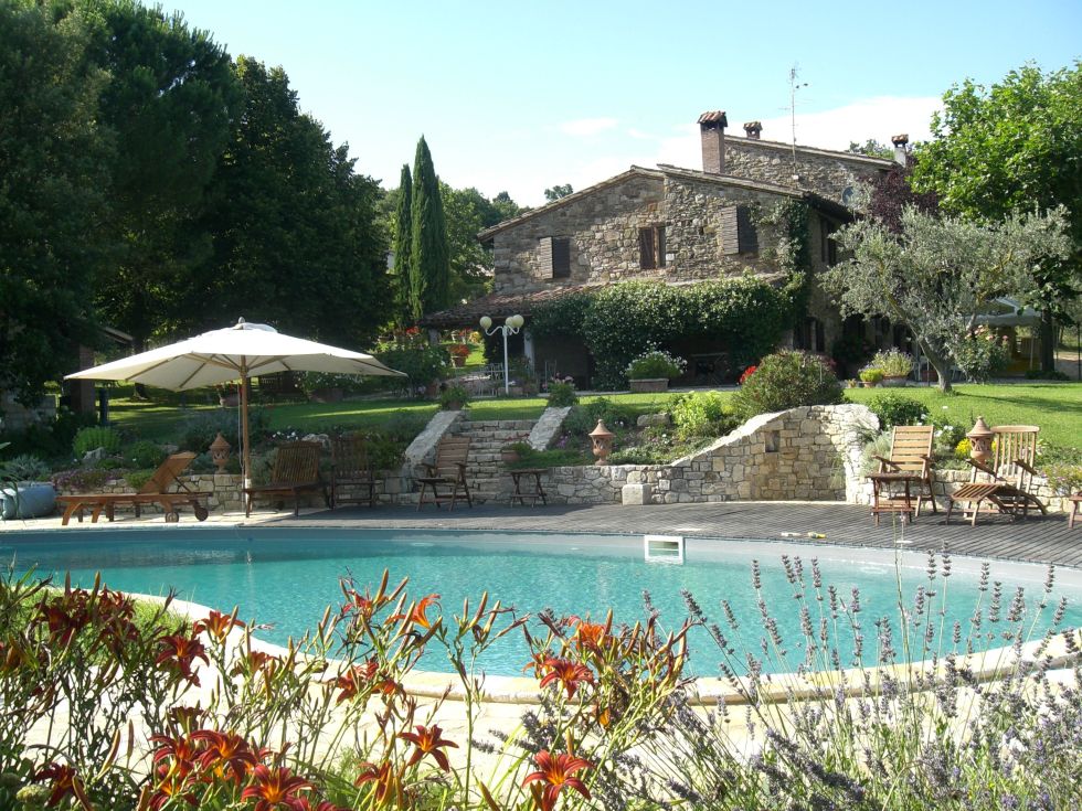 The house is surrounded by 5500 square meters of gardens and mature trees. The beautiful curved pool, with a 14-meter swimming lane and outdoor shower, is surrounded by flower beds, two small, natural lakes and a spacious stone terrace with stunning views of Todi and the green hills of Umbria.